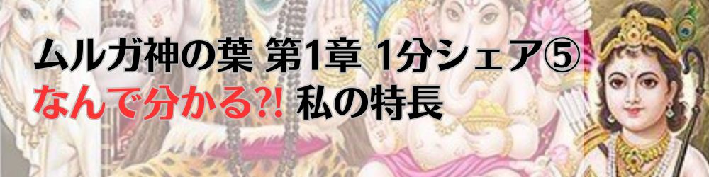 【ムルガ神の葉 第1章 1分シェア⑤ なんで分かる?! 私の特長】(録音書き起こし)本人は非常に正直で、自分の感じることを思うことを率直に人々に伝えるいい性格をいい人格を持っていて、これからもそのやり方で自分の仕事を進めて非常に皆んなに喜ばれるようになります。そして色々な分野の技術的な細かい面をよく理解し、それを簡単な言葉にして自分のところに来る人たちに上手に教えます。精神世界の古い情報、昔の人々が良くなるために教えられた情報などをよく勉強し、研究して、そういう情報の非常に命となるところまでよく理解して、それを上手に皆んなに教えて、皆んなの人生を大きく変えていく能力があります。